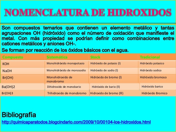 Formulación: El símbolo del metal seguido del grupo hidroxilo y después el no metal.